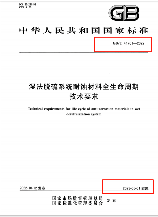 近日,安徽陶博士環保科技有限公司作為起草單位之一參與起草制定的國家標準《GB/T 41761-2022 濕法脫硫系統耐蝕材料全生命周期技術要求》于2023年05月01日正式施行。